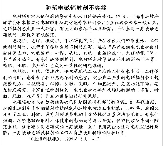 Ëæ×ÅÉç»áºÍ¿ÆÑ§¼¼ÊõµÄ·¢Õ¹£¬ÎÒ¹ú¸Ä¸ï¿ª·ÅµÄÖð½¥ÉîÈ룬×ۺϹúÁ¦µÄÌá¸ß£¬Ô½À´Ô½¶àµÄµç×Ó²úÆ·»áÀ´µ½ÎÒÃÇÉí±ß £¬Î´À´µÄÊÀ½çÊÇÒ»¸öµç×Ó»¯µÄÊÀ½ç¡£Õþ¸®°ì¹«µÄÎÞÖ½»¯¡¢ÍøÂ绯µÄÊ©ÐУ¬¹¤³§µÄµç¿ØÖÇÄÜ»¯£¬Ñ§Ð£½ÌѧµÄµç×Ó»¯£¬µç×ÓͼÊéµÄÆÕ¼°£¬¸öÈËͨѶµÄѸÃÍ·¢Õ¹µÈµÈÒ»ÇУ¬¶¼Ô¤Ê¾×ÅÕâһʱ´úµÄµ½À´¡£Ãæ¶ÔÕâÒ»·¢Õ¹³±Á÷£¬±Ï½ÚÊÐÃñ¶Ôµç´Å²¨µÄÁ˽âÇé¿öÈ´²»ÈÝÀÖ¹Û£¬´óÔ¼ÓÐÒ»°ëµÄÈ˶Եç´Å·øÉäÖªÖ®ÉõÉÙ¡£ÎÒÃÇÓ¦¸Ã×öÐ©Ê²Ã´ÄØ£¿